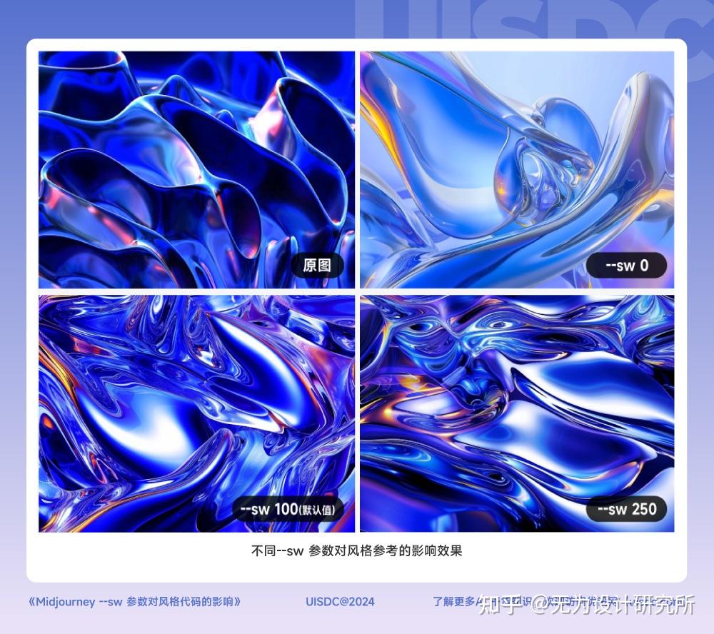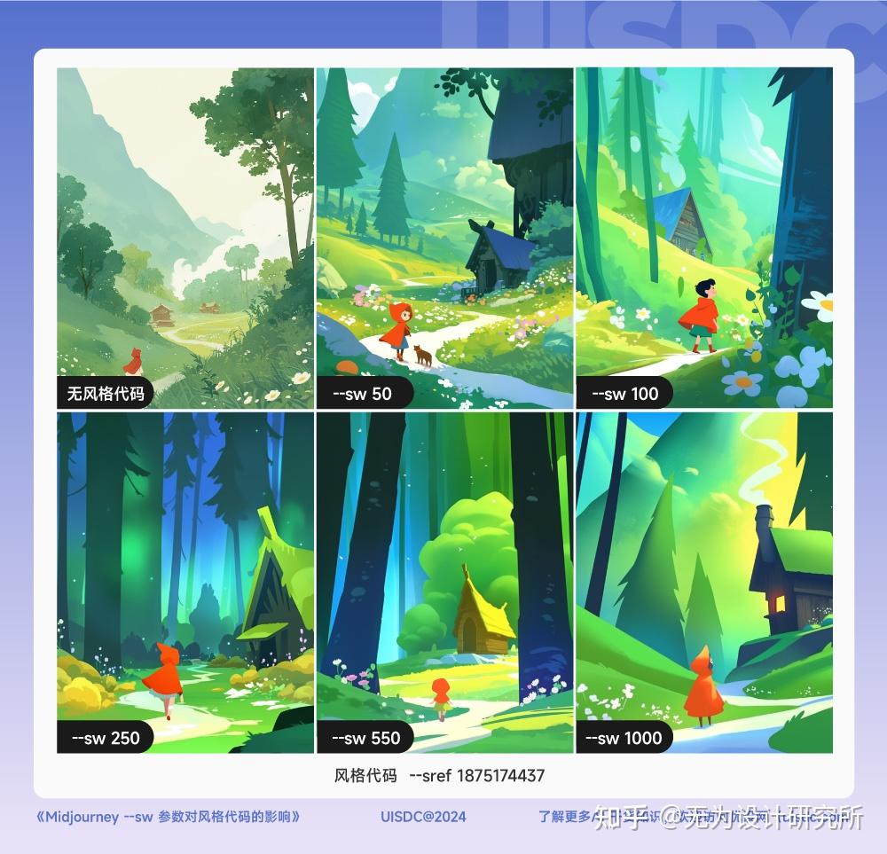 因此我们每次使用 --sref code 时,得到的仅仅是一种在 --sw 100 限制之下的效果; 而 --sw 的数值范围是 0 - 1000,如果我们一进步尝试其他不同的数值,比如 50、550、750 或 1000,就能得到更多不同的样式。