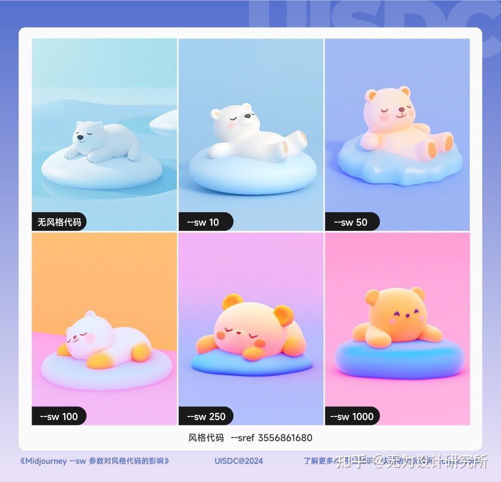 --sref 3556861680 可以赋予图像色彩柔和、带磨砂质感的 3D 风格,也能让角色形象比默认的更圆润可爱。当它的应用强度在 50 以下时,整体效果最合适;进一步变强时,本该是白色的北极熊会被染上橙色、甚至完全变成棕橙色,影响了提示词该有的效果;图像整体色彩也会过于饱和,看起来并不舒服。
